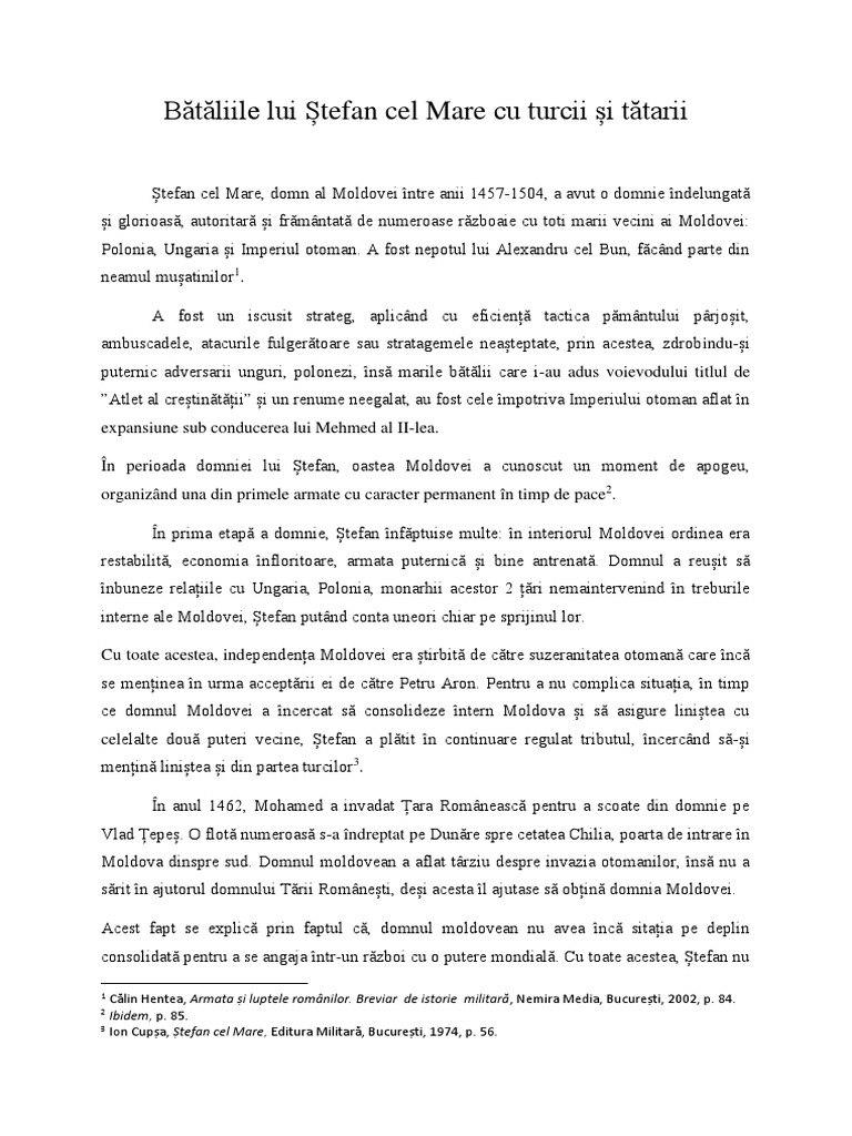 Binecredinciosul voievod ștefan cel mare și sfânt a fost cel mai de seamă domnitor al moldovei, domnind între 14 aprilie 1457 și 2 iulie 1504. Armata condusă de matei corvin, regele ungariei. Otomanii, polonezii, tatarii si in luptele de sprijin ale lui vlad tepes, daca nu ma insel si iancu de hunedoara. Domnia lui stefan cel mare, de aproape o jumatate de veac, este cel mai frumos timp din istoria moldovei. Domnitorul moldovei ar fi avut o înălţime în jurul a 150 cm, ipoteză confirmată de cronicarul ion. Datele care ne stau la dispoziţie arată că, în fapt, el a avut 24 bătălii şi a învins în 22. Stefan voda, domn cel mare, seaman pe lume nu are, decat numai mandrul soare . Domnia sa a echipat o oaste puternica, bine pregatita, inaltand numeroase. Se pare că ștefan cel mare nu era chiar așa mare. Un corp expediţionar, condus de iskender bey şi bali bey malkocoglu, a intrat, în luna februarie, în ţară, ceea ce reprezenta o situaţie neobişnuită deoarece otomanii nu luptau din toamnă până în primăvară. Victoria lui ştefan cel mare. Oastea condusă de petru aron, domnul moldovei. Valea albă a fost o înfrângere, dar a provocat otomanilor pierderi.